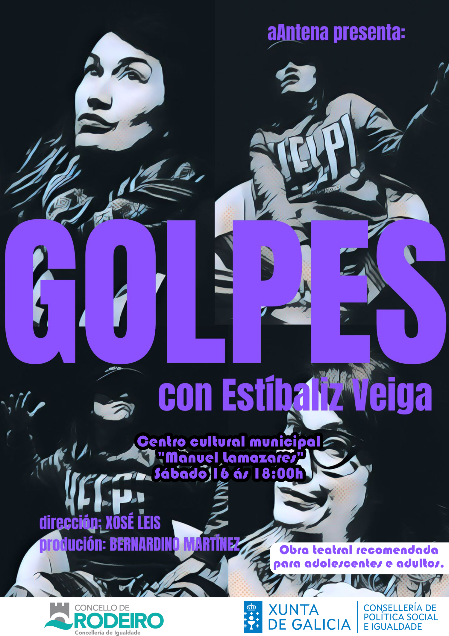 “Golpes” é unha peza teatral contra a violencia machista dirixida por Xosé Leis e protagonizada pola actriz Estíbaliz Veiga, na que da vida a Pamela, una moza que sufriu violencia machista e nos conta como foi a súa vida, a súa relación, os “GOLPES” que recibiu.